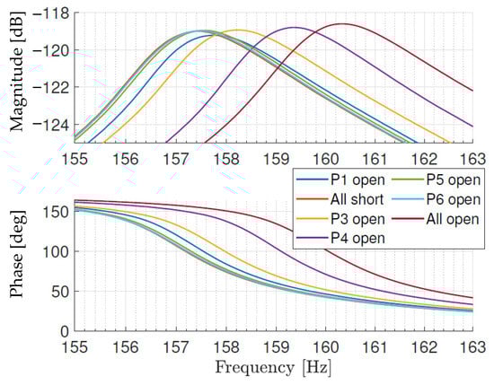In total, six piezoelectric transducers were integrated into the demonstrator setup (see Figure 10). The strain energy, per transducer was obtained using FEM simulations (Modal Analysis in Ansys). The level of strain energy reflects the level of obtainable damping (Equations (10) and (11)). Note that the strain energy values from the FEM are only indicative of the effectiveness of damping a particular mode shape and should only be used as such. Because of the asymmetry of the structure, transducers P1 and P3 turn out to be the most efficient for dampening the mode at 150 Hz in the direction, and transducers P4 and P2 are the most effective for dampening the mode at 210 Hz in the direction (see Figure 11).