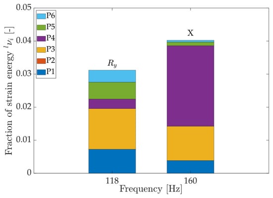 Fraction of strain energy for the - and -mode shapes from the measurement at 293 K. P2 is used for excitation to measure the FRFs.
