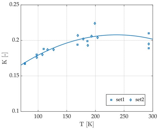 The generalized electromechanical coupling factor, , for the translation mode in the X direction at 160 Hz, was measured as a function of the temperature during heating from 77 K at a rate of about 10 K/h, as shown in Figure 17. The thermal cycle was repeated twice, leading to the following two data sets: set 1 and set 2. For each data point, the resonance frequency of the system was measured when all the transducers had open and short-circuited electrodes; next, was deduced using Equation (9). The solid line describes an approximate fit. As expected, decreased as the temperature decreased due to the change in the piezoelectric material property of (see Figure 8), exhibiting a maximum of around 200 K, which is likely associated with the change in the setup stiffness distribution and, thus, the fraction of strain energy addressed by the various transducers.