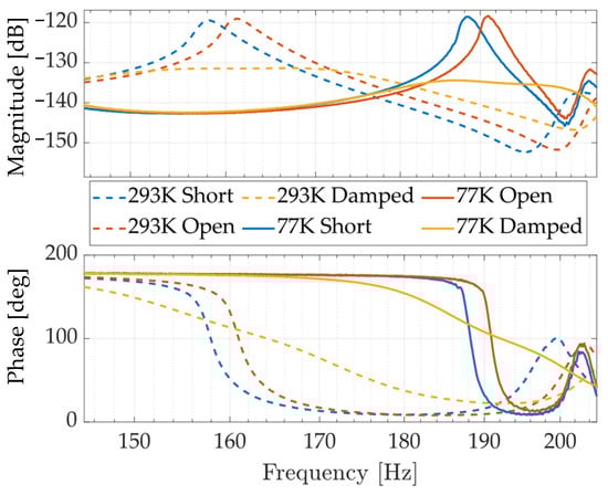 First, the setup was cooled to 77 K using liquid nitrogen, as shown in Figure 13; then, the system was enclosed with a 50 mm layer of thermal isolation. No active cooling was used. Slowly, the temperature increased at a rate of less than 10 K/h. As the temperature increased, system identifications (FRF measurements) were performed at distinct temperatures and under various electrical boundary conditions. Typically, each measurement takes only a few minutes and, therefore, the parameters are assumed to be unchanged. The temperature cycle was repeated twice, and each measurement was performed twice.