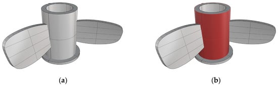 As shown in Figure 5a, the propeller model is divided into the basic part (i.e., the non-overhanging part) and the overhanging parts. As shown in Figure 5b, the basic part is a hollow cylinder, which is marked in red; one of the overhanging parts of the model is marked in green, as shown in Figure 5c, and the model has three overhanging parts in total. When the overhanging parts are printed using the traditional three-axis AM method, support structures need to be added to the bottom of the overhanging parts. However, the method proposed in this study will first use the three-axis AM process to produce the basic part of the model to ensure manufacturing efficiency, and the overhanging parts will be manufactured using the five-axis AM process to achieve support-free printing.