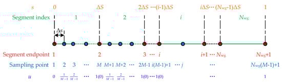 The optimization problem described in Equation (28) is infinite-dimensional in the continuous domain. In practical engineering applications, it is difficult to obtain an analytical solution directly. In this section, a direct transcription method is adopted to discretize the problem, resulting in a large-scale finite-dimensional optimization model in the discrete domain. As illustrated in Figure 1, the machining path is first divided into  cubic spline segments. Then, within each segment, the path-length parameter is further uniformly sampled, and kinematic and dynamic constraints are imposed at each sampling point. Suppose the number of discrete points in each spline segment is M. For a given path, the above discretization yields  spline segments,  segment endpoints, and the total number of sampling points is , with a uniform sampling interval of .