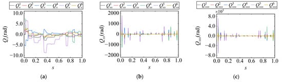 First-, second-, and third-order derivatives of the joint path with respect to the path parameter for the star-shaped path. (a) First-order derivative; (b) second-order derivative; (c) third-order derivative.