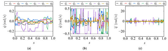 During path-following tasks, the robot must satisfy kinematic constraints in joint space, which mainly include limitations on joint angular velocity and angular acceleration. Let  and  denote the upper bounds of angular velocity and angular acceleration, respectively. Since these constraints are typically symmetric about zero, the corresponding lower bounds are given by  and . Accordingly, the joint angular velocity and acceleration constraints can be formulated as