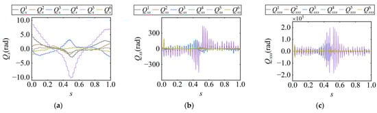 According to the properties of continuous functions, the following is stated: (a) the result of addition, subtraction, multiplication, or division of continuous functions preserves the same order of continuity; and (b) if the outer function is continuous up to the required order and the inner function is also continuous to the same order within its domain, then their composite function will have the same order of continuity. In other words, both basic operations and functional compositions preserve the continuity order of a function. Therefore, based on the analysis of Equation (19), to ensure the continuity of , , and , the following conditions must be satisfied: (a) , , and  are continuous, which implies that the given path must be C3 continuous with respect to the path length; and (b) the decision variables , , and  are continuous.
