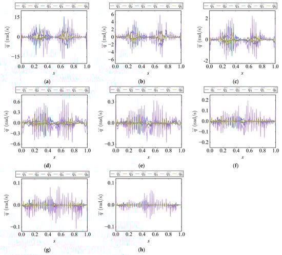 To ensure a smooth start and stop of the robot trajectory, boundary constraints have been imposed on  by setting its values to zero at the start and end of the path. This guarantees that the joint velocity at the beginning and end of the trajectory is zero. Based on this, to further improve smoothness during the start and stop phases, the pseudo-acceleration is also set to zero at the start and end of the path. The corresponding constraint can be expressed as .