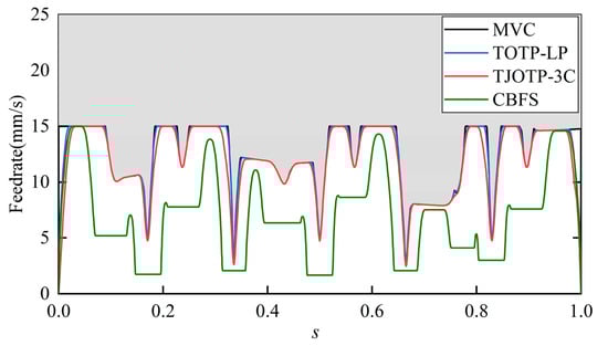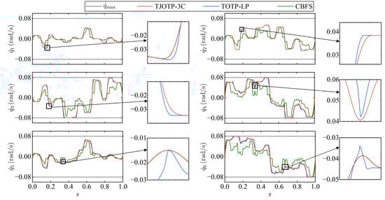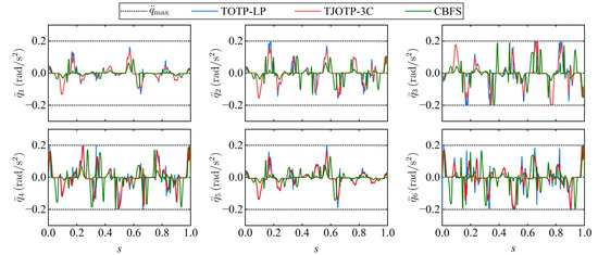 In the TJOTP-3C method, the path discretization parameters are kept consistent with those used in the previous two experiments. To demonstrate the advantages of the proposed approach, two other trajectory planning methods are selected for comparison. The first is the time-optimal trajectory planning method based on linear programming (TOTP-LP) proposed by Liu et al. []. Although this method considers only constraints in joint space, it belongs to the class of convex optimization methods, similar to the proposed approach, and is therefore adopted as a comparison method to validate the effectiveness of the continuity constraints in TJOTP-3C. The second is a CBFS-based method proposed by Jia et al. []. Ref [] defined regions where the maximum velocity curve falls below the commanded feedrate as velocity-sensitive regions. In these regions, the end-effector feedrate is kept constant. In contrast, S-curve acceleration and deceleration profiles are applied in non-sensitive regions to ensure smooth speed transitions. As CBFS is a representative feedrate scheduling strategy in trajectory planning, this method is used as another comparative approach. Originally designed for five-axis CNC machining without considering joint-space constraints, the method is adapted in this study by introducing the proportional adjustment strategy [] to ensure compatibility with joint kinematic constraints. In addition, the trigonometric acceleration and deceleration profile are used in place of the S-curve profile in Ref [] to achieve C3 continuity in the trajectory.