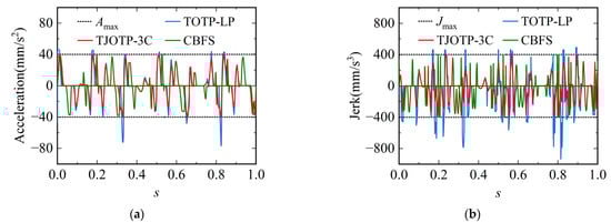Although the TOTP-LP method provides higher trajectory execution efficiency, it imposes full kinematic and dynamic constraints only in the joint space. In the Cartesian space, TOTP-LP can constrain feedrate but lacks the ability to limit EE acceleration and jerk. As a result, the trajectory generated by TOTP-LP shows violations of the EE acceleration and jerk constraints, as illustrated in Figure 16. In contrast, both the TJOTP-3C and CBFS methods apply full kinematic constraints in both joint and Cartesian spaces, ensuring that the end-effector velocity, acceleration, and jerk remain within their respective limits. Additionally, the TJOTP-3C method explicitly incorporates continuity constraints, while the CBFS method employs a trigonometric acceleration profile that is inherently C3 continuous. These characteristics lead to smoother trajectories, which reduce jerk and vibration when compared to the C1 continuous trajectory produced by TOTP-LP.