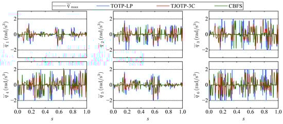 By applying inverse kinematics, the trajectories generated by the TOTP-LP, TJOTP-3C, and CBFS methods are transformed into joint space. The corresponding joint angular velocity, acceleration, and jerk profiles are shown in Figure 17, Figure 18 and Figure 19, respectively. All three methods produce joint trajectories that satisfy the specified constraint limits, confirming the effectiveness of the compound constraint strategy proposed in this study.
