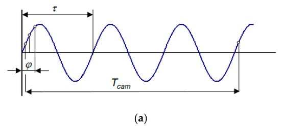 In the case of periodic SJ measurement, it is necessary to synchronize the SJ actuator with the measuring system, respective to the external trigger of the camera, in order to capture the SJ exactly at a defined relative time. Considering the period of the SJ τ, and a relative time t’ = t/τ within one period, synchronization enables the phase maps to be captured at the well-defined relative time instances, at different periods of the signal t = t’ + M τ, where M stands for an integer. Assuming the coherence of the phenomenon the phase field, is supposed to be constant as M increases. This synchronization principle is shown in Figure 4a. The synchronization of the camera with a measured phenomenon brings three advantages. On the one hand, it is the possibility of measuring the entire period with a camera that has a significantly longer frame time. In this particular example, the SJ actuator operates at a frequency of 15 Hz (the period is 67 ms) and 8 Hz (125 ms), respectively. The 5 Mpx camera used was relatively slow; its maximum frame rate at this resolution was about 6 FPS (167 ms). Therefore, at least 300 FPS at a frequency of 15 Hz is required (i.e., 20 samples per period), or 37 samples per period, at a frequency of 8 Hz. Assuming the similarity of the vortexes exhausted from the SJ actuator orifice in every cycle, it is possible to synchronize the trigger of the individual frames on the camera at a particular chosen phase of the SJ period.
