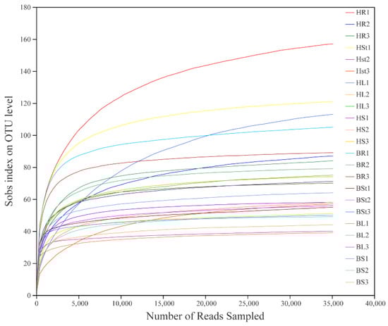 A total of 24 samples of S. alopecuroides roots, stems, leaves, and seeds were sequenced in high throughput and a total of 133,916 high-quality sequences with an average sequence length of 246 bp were obtained after quality filtering. At a 97% similarity level, a total of 751 operational taxonomic units (OTUs) were obtained. Moreover, the fungal OTUs were assigned to 9 phyla, 27 classes, 66 orders, 141 families, 245 genera, and 340 species. The rarefaction curve reflects the sequencing depth of the sample, which can be used to assess whether the sequencing volume is sufficient to cover all taxa. As shown in Figure 1, the rarefaction curve indicated that the number of OTUs was sufficient and saturated in each sample.