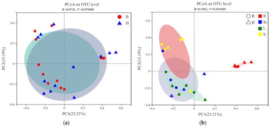 Principal coordinates analysis (PCoA) based on the relative abundance of fungal OTUs showing the fungal community structure: (a) in different sample sites: B (Circular), H (triangle); (b) in four organs: R (red color), St (blue color), L (green color), S (yellow colors).