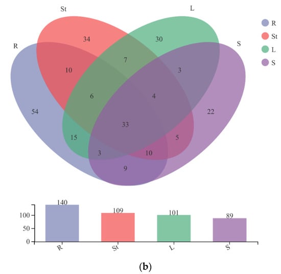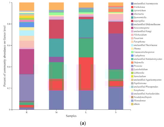 The differences in the composition of plant endophytic microbial communities depend not only on plant species, living environment, different stages of plant growth and development, and health status but also on plant organs or tissues that play an important role in microbial colonization [,]. Siddique et al. [] reported on the microbial communities of buds and twigs in two beech forests using HTS and found that it was plant organs rather than the habitat that determined the endogenous microbiota of young beech trees. Küngas et al. [] compared the diversity and community structure of fungi inhabiting leaves, branches, and trunks of Alnus incana and Corylus avellana growing at three hemiboreal forest sites. The results showed that tree organs were the main determinants of fungal community structure, whereas the effects of the host species and locality remained secondary and negligible. Among them, the fungal community structure in the trunk was significantly different from that in the leaves and branches. We also found that different organs are the main reason for the differences in the community structure of endophytic fungi in S. alopecuroides, which may be related to the fact that the endophytic fungi are in an in planta environment and the fungal community is less affected by the external environment.