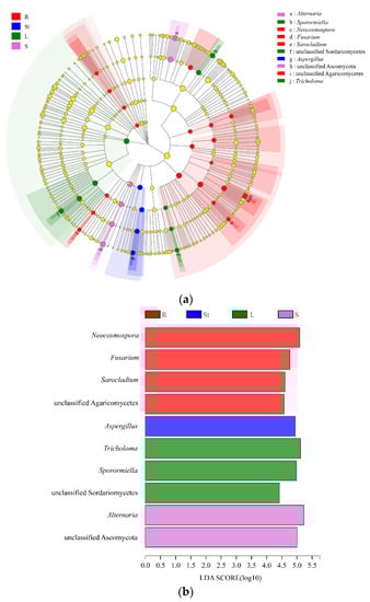 Biomarkers in different organs of S. alopecuroides: (a) LEfSe was used to identify the most differentially abundant taxa among four organs of S. alopecuroides. Cladogram generated by LEfSe indicating differences between the four organs at phylum, class, order, family, and genus levels. Each successive circle represents a phylogenetic level. Color regions indicate taxa enriched in the different organs. Differing taxa are listed on the right side of the cladogram. (b) Bar graph showing LDA scores for fungal taxa; only taxa meeting an LDA significant threshold >2 are shown.