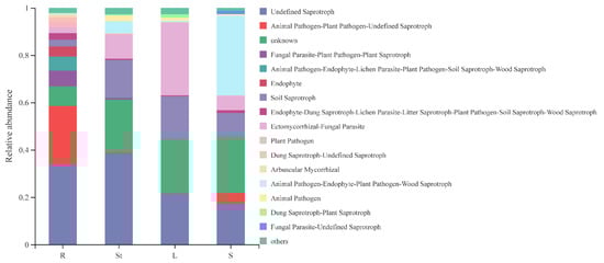 Functional Guild (FUNGuild) is a tool used for the classification and analysis of fungal communities in a microecological guild []. The results of the FunGuild software-based analysis showing the combined species abundance <0.01 and the unknown functional groups, a total of 15 major ecological functional groups of S. alopecuroides were annotated (Figure 5). Among the 15 ecological functional groups of endophytic fungi of S. alopecuroides, 4 were saprotroph, including undefined Saprotroph, soil saprotroph, dung saprotroph-plant saprotroph, and dung saprotroph-undefined saprotroph, totaling 40.39%. Only two were pathotroph, including plant pathogen and animal pathogen, which accounted for 1.93%, and two were symbiotroph, including endophyte and arbuscular mycorrhizal with 1.41%. Moreover, there were seven mixed trophic types of fungi: ectomycorrhizal-fungal parasite, animal pathogen-endophyte-plant pathogen-wood saprotroph, animal pathogen-plant pathogen-undefined saprotroph, fungal parasite-plant pathogen-plant saprotroph, animal pathogen-endophyte-lichen parasite-plant pathogen-soil saprotroph-wood saprotroph, endophyte-dung saprotroph-lichen parasite-litter saprotroph-plant pathogen-soil saprotroph-wood saprotroph, fungal parasite-undefined saprotroph, totaling 34.91%. In addition, a large proportion (19.25%) of the flora with unknown functions were also present and their functions need to be further explored.