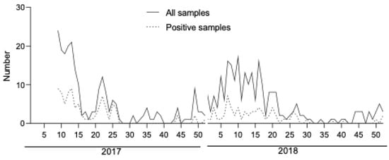 Weekly distribution of samples. A weekly distribution of all samples (solid line) and RT-PCR positive samples (dashed line) included during the study period is shown.