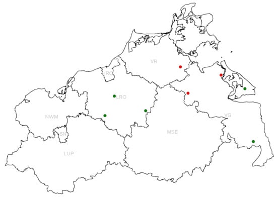 Location of sampled farms in the federal state of Mecklenburg-Western Pomerania. Conventional fattening farms are depicted in red and organic ones in green. The district names are indicated in light gray (HRO = Hansestadt Rostock, LRO = Rostock-Land, LUP = Ludwigslust-Parchim, MSE = Mecklenburgische Seenplatte, NWM = Nordwest-Mecklenburg, SN = Schwerin, VG = Vorpommern-Greifswald, VR = Vorpommern-Rügen).