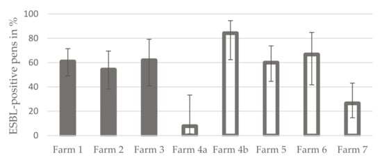 Dohmen et al. showed that the probability of finding ESBL-producing E. coli on a farm was greater when piglets were purchased. This result was not statistically significant, but a trend could be observed []. Fertner et al. showed that pig farms with a low use of antibiotics, among others, purchased weaner piglets from only one supplier []. The impact of the farms of origin on the ESBL status of the fattening pig farms became also evident in our study when the organic farms 4a and 4b were compared. Although the same person was responsible for the management of both farms, they showed the greatest difference of all farms overall in terms of the proportions of ESBL-positive pens. One major difference between the two farms was that they obtained their piglets from different suppliers. Thereby, diseases continuously occurred in the fattening pigs in farm 4b. The pigs regularly had diseases of the respiratory tract, they often had problems with joint inflammations, tail biting and cannibalism, as well as regularly occurring diarrhea. For this reason, not only individual animals received antibiotics in farm 4b, but they were sometimes used in the whole fattening group. This may have triggered an increase in ESBL-positive pens. On farm 4a, the fattening pigs also showed diseases of the respiratory tract, but they were milder and rarely required the use of antibiotics, which were only administered to individual animals. A similar situation was present on farm 7. The farm produced its own piglets and had the lowest proportion of ESBL-positive pens following farm 4a.