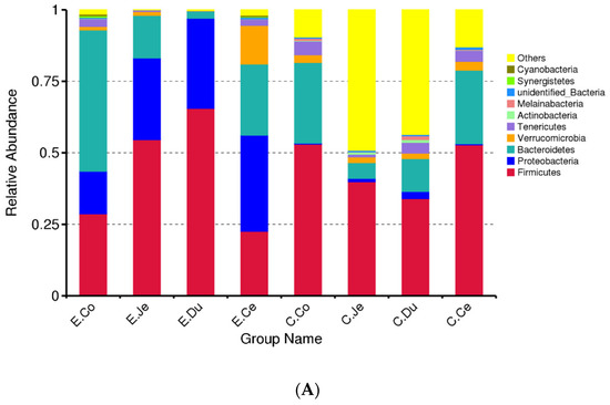 At the phylum level, the bacterial communities in the FIS were mainly Bacteroidetes (23.62%), Firmicutes (42.38%), and Proteobacteria (24.78%) (Figure S2). The top ten most abundant phyla in each group were selected to generate a column accumulation chart of relative abundance (Figure 5A), including Firmicutes, Proteobacteria, Bacteroidetes, Verrucomicrobia, Tenericutes, Actinobacteria, Melainabacteria, unidentified_Bacteria, Synergistetes, and Cyanobacteria. However, the relative abundance of these phyla was dissimilar in the FIS (Table S4). For instance, Firmicutes, Proteobacteria and Bacteroidetes were the dominant in the FIS, and these dominant bacteria were different between the FIS and the two groups. Additionally, compared with the Con, the average relative abundance of Firmicutes decreased in large intestine, whereas the other two dominant bacteria (Proteobacteria and Bacteroidetes) increased in the FIS, and the relative abundance of Firmicutes is lower in the large intestine in Dia (Table S4). The relative abundances of Tenericutes and Melainabacteria were also lower in the Dia than in Con. Melainabacteria was not detected in the jejunum of Dia, while it was detected in the Con (Table S4). We also observed that the abundance of Bacteroidetes in the duodenum was the lowest in the Dia (Table S4). Finally, we also found that Synergistetes were detected only in the large intestine of the Dia (Table S4). According to the significant differences between the FIS of the two groups, two phyla were selected in the Dia, including Firmicutes and Bacteroidetes (p < 0.05), and three phyla were selected in the Con, including Firmicutes, Bacteroidetes and Tenericutes (p < 0.05) (Table S4). Firmicutes and Bacteroidetes showed significant differences among the FIS (p < 0.05), while the other eight phyla were not significant (p > 0.05) (Table S4).