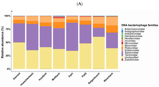The shotgun sequencing produced between 40 to 57 million paired reads per sample generating an average of 6.2 million contigs after assembly. From 75 to 99% of the total raw reads mapped back to the contigs. Of these mapped reads, between 0.01% and 0.04% were virus-affiliated reads (Supplementary Table S1), corresponding to a total of 37 known viral families for all sites included. Among these families, 13 DNA bacteriophage families were identified and represented between 89% and 96% of all virus-affiliated reads (Figure 3A). The DNA bacteriophage composition was strongly characterised by the Caudovirales order with between 75% and 93% of the total metagenomics identification. This high proportion was mainly due to the high abundance of Siphoviridae (13.9% to 49%), Myoviridae (5% to 12%) and Podoviridae (4% to 10%). Caudovirales gathers all the identified DNA bacteriophage families, except for Autolykiviridae (unclassified order) in Daerent and Mollbach soils, Microviridae (Petitvirales) and Tectiviridae (order Kalamavirales) both present in every site. By investigating each site, Siphoviridae was found to always be the most identified family, especially in the soils of Pall 1, Hueschterbach, Mollbach, Koulbich and Pall 2 (with, respectively, 49.58%, 44.83%, 35.15% and 34.80%) while its abundance was the lowest for Retgenbusch (13.9%). Regarding Myoviridae and Podoviridae, the former was highly abundant in Koulbich (10.65%), Retgenbusch (10.9%) and Weierbach (12.3%) while the latter was rather highly present in the soils of Weierbach (10.2%) and Mollbach (10.3%). It is noteworthy that most of the assigned DNA bacteriophages from the libraries belonged to the unclassified Caudovirales (between 29% and 51%). Of the two ssDNA bacteriophage families, i.e., Inoviridae and Microviridae, both were detected by the metagenomics with a low abundance in all sites (between 0.09% and 1.6% for the former and between 0.06% and 1% for the latter), while all the previously mentioned families are dsDNA bacteriophages.