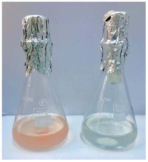 Liquid culture of G. phototrophica showing growth in the medium containing 50 mg CaCl2 L−1 (left flask) and no growth in medium without added CaCl2 (right flask).