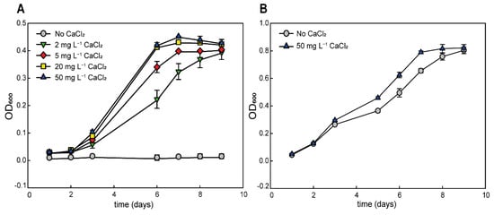 (A) Growth rate of G. phototrophica grown in liquid media with different CaCl2 concentrations. (B) Growth rate of G. groenlandica in medium with 50 mg CaCl2 L−1 and in medium without added CaCl2.