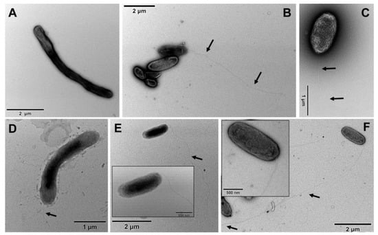 Transmission electron microscopy images of G. phototrophica and G. groenlandica cells grown in with and without CaCl2. (A) Cells of G. phototrophica in 2 mg CaCl2 L−1 were long rod shaped without flagella. (B) Cells of G. phototrophica in 20 mg CaCl2 L−1 were short rod shaped with polar flagella. (C) Cells of G. phototrophica in 50 mg CaCl2 L−1 were rod shaped with flagella. (D) Cells of G. groenlandica in 2 mg CaCl2 L−1 were rod-like and elongated in shape with short flagella. (E) Cells of G. groenlandica in 20 mg CaCl2 L−1 were rod shaped with flagella. (F) Cells of G. groenlandica in 50 mg CaCl2 L−1 were rod shaped with long flagella. Scale bar is included in each figure. Inlet shows the close-up images. Arrows show the flagella.