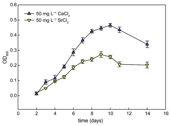 Growth rate of G. phototrophica grown in liquid media with 50 mg L−1 CaCl2 and 50 mg L−1 SrCl2.