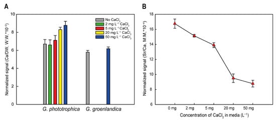 (A) Accumulation of calcium in G. phototrophica and G. groenlandica cells grown in nutrient media containing different concentrations of CaCl2. (B) Accumulation of strontium in G. phototrophica cells grown in nutrient media containing different concentrations of CaCl2.