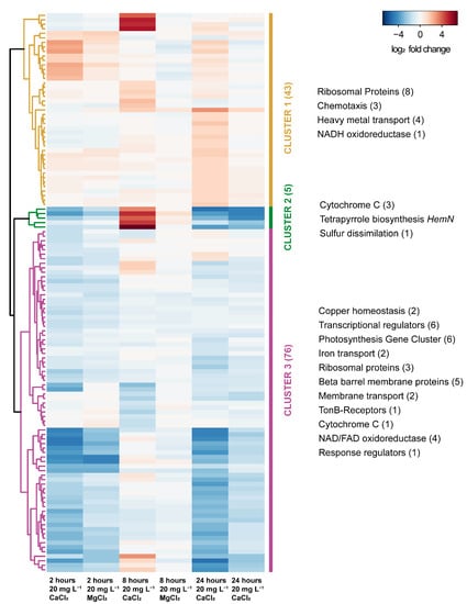 Heatmap and hierarchical clustering based on the Euclidean distance of the log2 FC of significantly differentially expressed genes in 20 mg CaCl2 L−1 and 20 mg MgCl2 L−1 at 2 h, 8 h, and 24 h after amendment. The colors indicate three clusters obtained by cutting the tree at the earliest branching points. Functions of genes within the clusters are noted on the left with the numbers of coding genes in brackets.