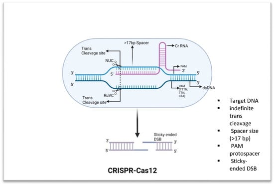 Fundamental components of CRISPR-Cas12. Cas12 has trans-collateral activity that allows it to cleave dsDNA that is not specific. Distal 5′-T-rich PAMs are recognized by Cas12 enzymes, which produce staggered double-strand breaks.