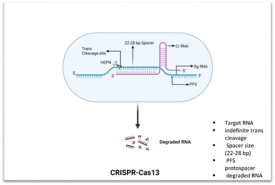 CRISPR/Cas13, on the other hand, can be used against both DNA and RNA viruses. It is possible to employ Cas13 to specifically target viral RNA and cleave it, preventing viral transcription and replication (Figure 3). Additionally, the system could be used to target specific bacterial genes or pathways, allowing for the development of targeted therapeutics that could be more effective than traditional antibiotics []. The results from a study by Kiga et al. [] demonstrated that CRISPR-Cas13a was more effective than CRISPR-Cas9 at reducing the expression of IMP-1 (Metallo-beta-lactamase-1), a carbapenem-resistant gene that offers resistance to a broad range of beta-lactam antibiotics, including carbapenems. When used in combination with a crRNA targeting blaIMP-1, Cas13a was shown to lead to a 2–3-log decrease in bacterial cells. Their results suggest that CRISPR-Cas13a could be a viable alternative to CRISPR-Cas9 for treating bacterial infections caused by multidrug-resistant bacteria.