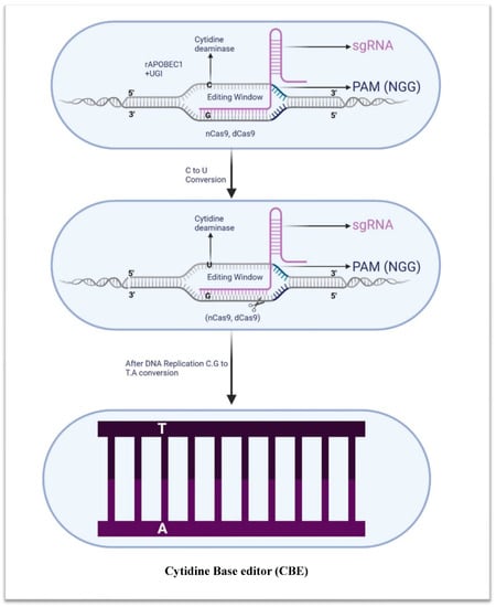 In 2016, the first report of a cytosine base editor was published, when a group of researchers at Harvard and MIT adapted the system of CRISPR-Cas9 to edit the single cytosine base in DNA []. The first generation of cytosine base editors (CBEs) utilizes Cas9 or dCas9 (catalytically inactive Cas9) to target a specific DNA sequence. The complex alters a cytosine in the sequence by changing it to a uracil, which is then interpreted by the replicative machinery as a thymine, thus achieving the desired mutation (Figure 4). The APOBEC family of enzymes is a group of naturally occurring cytidine deaminases found in vertebrates which can modify single-stranded DNA/RNA in order to protect the organism from viral invasion []. Previously, this first-generation CBE1 was reported in a number of drug-resistant bacteria, namely Klebsiella pneumoniae [,], Pseudomonas aeruginosa [], Staphylococcus aureus [], Acinetobacter baumannii [], and Streptomycetes [,]. Although these base editors are more efficient, they can also introduce off-target edits and cytosine-to-uracil mutations at unwanted locations.