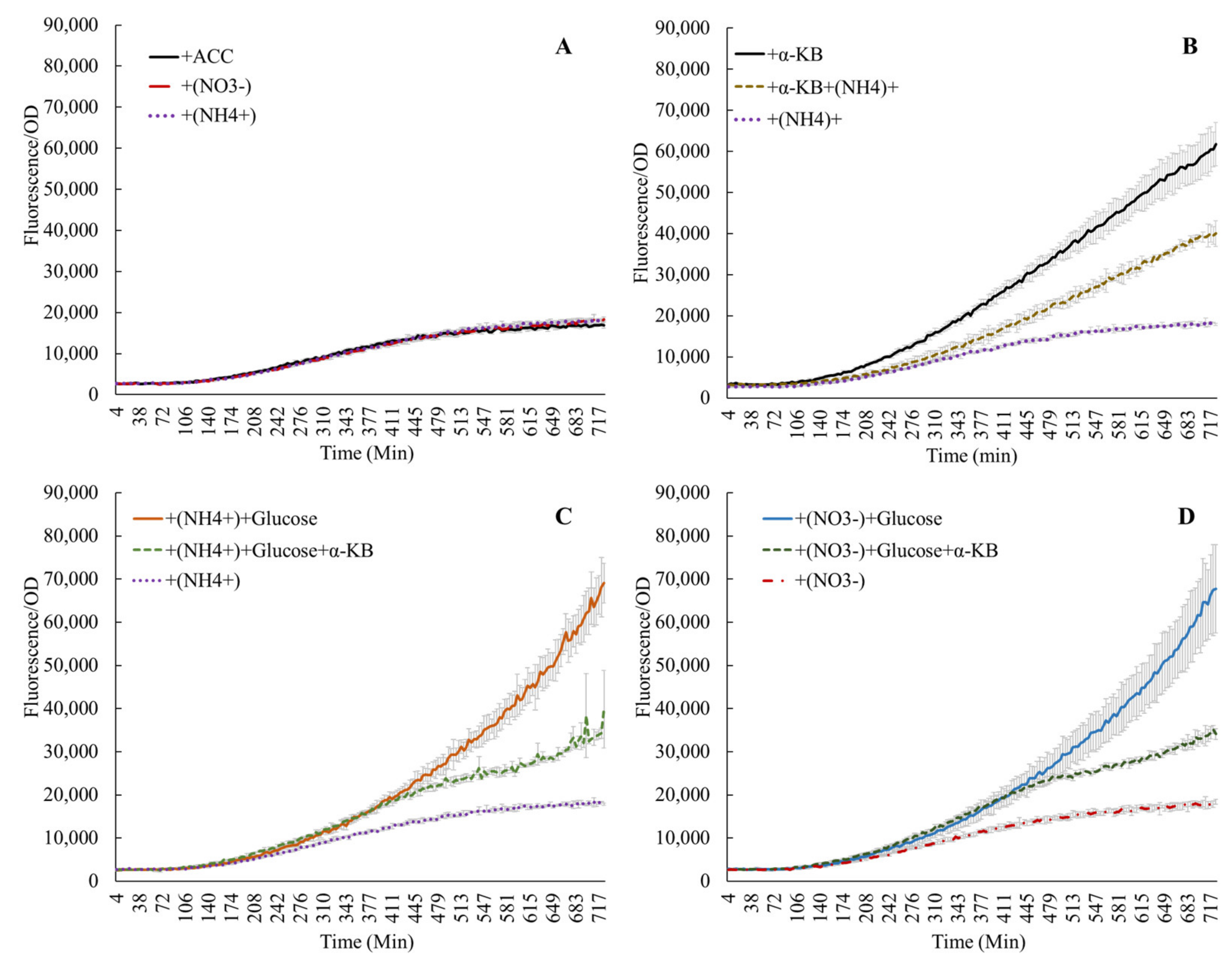 Activity of the acdS promoter in the presence of nitrate, ammonium, or ACC (A); α-ketobutyrate (α-KB) lowers the expression only in the presence of nitrogen (B), while the induced expression due to glucose is lowered in the presence of both the reaction products of ACC deaminase (C,D).