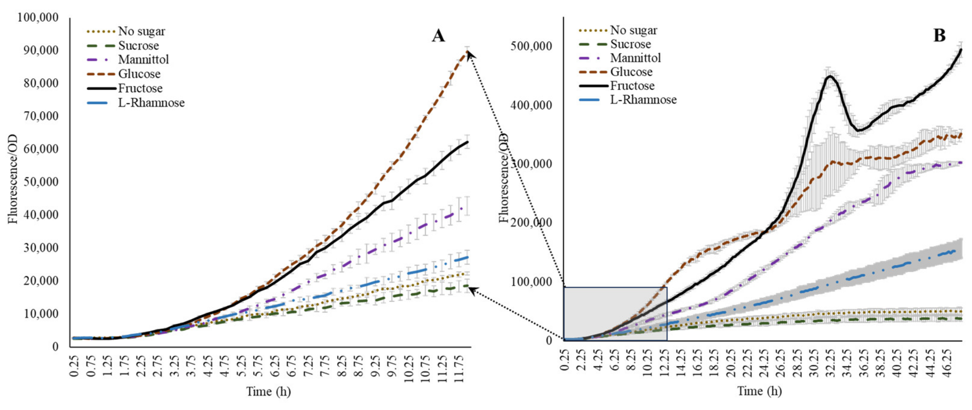 Following the evaluation of amino acids, optimization of the system to investigate the influence of individual sugar moieties was carried out. Although we could not detect sugars in native form within the wheat root exudates, evidence from the available literature indicates a dominance of sugars in root-secreted carbon in plants such as maize []. Therefore, to generate a wider context for microbial acdS interactions in general, we also included representative sugars in this study. A combination of glucose, ammonium, nitrate, and α-ketobutyrate was tested in presence of 100 ppm ACC. Glucose without N sources but with ACC induced the activity of the acdS promoter, while inclusion of either of the N sources lowered the expression (Figure 2C,D). The addition of α-ketobutyrate indeed slightly enhanced the expression, indicating that the presence of nitrogen has an influence on the acdS promoter. Sugars other than glucose influenced acdS promoter activity. Figure 4 shows that the other sugars could also positively induce the acdS promoter. Within the first 11–12 h (Figure 4A), glucose induced the promoter the most, but after 24 h of incubation, fructose was the dominant inducer. The observation that fructose is a better inducer when compared to glucose has also been made by [] in A. lipoferum 4B. Mannitol was almost as good an inducer as glucose, whereas l-rhamnose only displayed a small stimulation compared to the no sugar addition. Sucrose, however, in the present study, showed no induction although it was shown earlier to be present in the root exudates [].