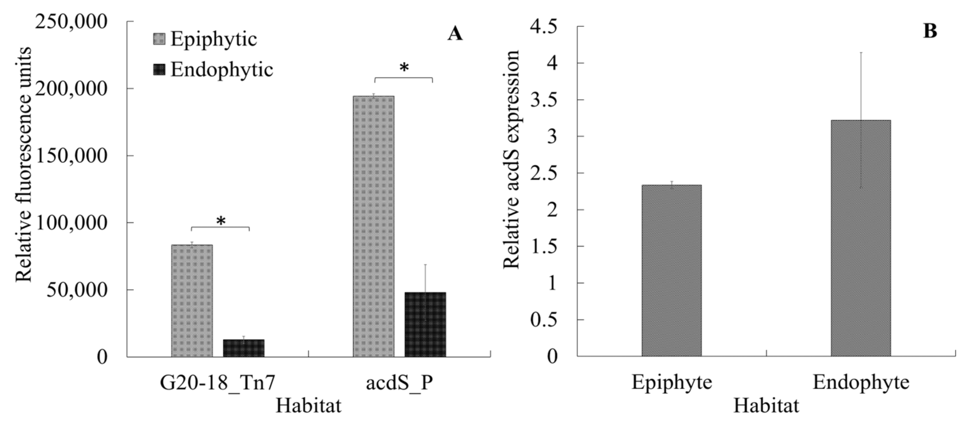 3.5. acdS Promoter Activity in Epiphytic vs. Endophytic Cells