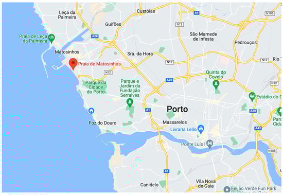 Matosinhos Beach is a highly frequented beach in Portugal (Figure 1), drawing visitors not only during the peak summer season but also throughout the winter months. This enduring popularity can be attributed to the presence of numerous surf schools. However, recent concerns have arisen regarding the water quality at this beach, prompting several inspection initiatives and water analysis. Reports have shed light on health issues experienced by surfers who frequent Matosinhos Beach, including gastrointestinal discomfort and skin irritations, which may be related to elevated levels of bacteria, notably intestinal Enterococci and Escherichia coli, detected in the waters []. Visitors to this beach are often discouraged from swimming due to bacteriological contamination, and it is suspected that one contributing factor could be the streams that flow into the beach [,].