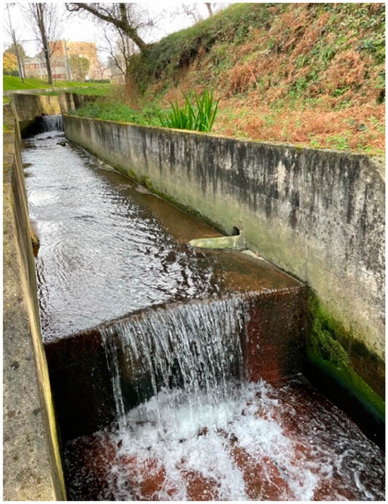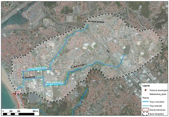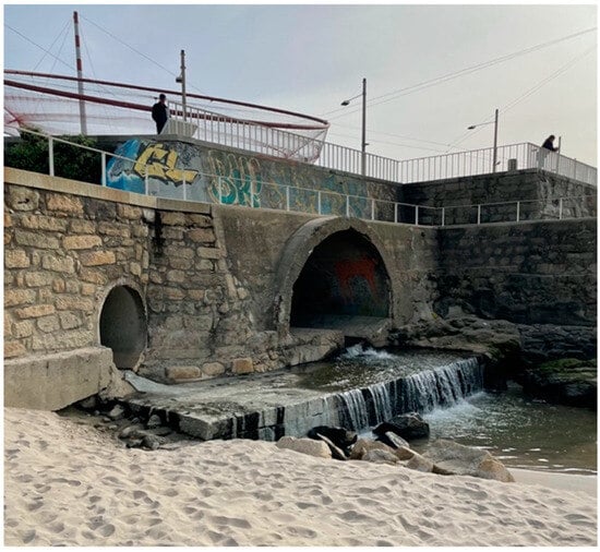 The Riguinha stream originates at Fonte das Sete Bicas and runs approximately 3.8 km before merging with the boundary between Matosinhos Beach and International Beach. Meanwhile, the Carcavelos stream, originating near Feira da Senhora da Hora, runs 2.7 km before converging with the Riguinha stream, near the intersection of Sousa Aroso Avenue and D. João I Street (Figure 2) []. As both water streams are in a highly urbanized and densely populated area, only a small section of the Riguinha stream is in the open, next to the Parque Real, in Matosinhos. In 2014, water analyses already revealed elevated concentrations of E. coli, suggesting the presence of fecal contamination in this stream. Bathing water quality is one of the most important criteria for the beach to earn a blue flag designation and often requires structural changes to domestic wastewater and rainwater drainage networks [].