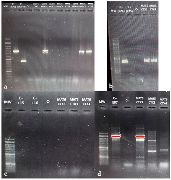 Finally, the results of the two simplex PCR assays performed to detect blaAmpC genes, namely blaDHA and blaCMY, are presented in Figure 3c,d, respectively. The AmpC-positive isolates tested included: MAT6CTX3 (KESC), MAT5CTX3 (E. coli), and MAT6CTX4 (KESC). In the first electrophoresis (Figure 3c), no bands appeared in the positive controls used, as they did not contain the blaDHA gene responsible for the phenotype, and no suitable controls were available in the laboratory. All three isolates tested negative for this gene.