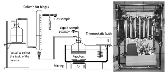 Batch anaerobic reactors were used to study the BMP in AcoD. The system consisted of 14 reactors, with 1 L total volume and 0.8 L working volume. The scheme of the configuration is shown in Figure 2. The reactors are set in a thermostatic bath to maintain a constant temperature. The assays were carried out at a temperature of 35 °C (mesophilic range). The production of biogas was collected and measured by water displacement. Graduated tubes were placed on top of reactors, which were connected to a reservoir measuring the produced biogas. The tubes were filled with a saline and acid solution composed of H2O (79%), NaCl (20%) and HCl (1%), to minimize the CO2 dissolution in the liquid. During the tests, the produced biogas generated a pressure that displaced the fluid in the graduated columns towards the reservoir, in a proportional amount to the generated volume. The biogas was measuring periodically by the displaced volume in standard conditions for temperature and pressure. The samples of biogas were collected using gas syringes.