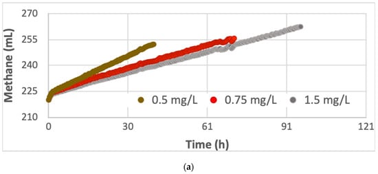 Different concentrations of sodium acetate: 0.5 g/L, 0.75 g/L and 1.5 g/L were used [,]. Fundamentally, acetoclastic bacteria are responsible for 70% of the methane produced in the anaerobic digestion process; consequently, the study of acetoclastic activity can estimate the inoculum activity. The reactors were purged with nitrogen (inert atmosphere) and sealed. For each concentration of sodium acetate, three tests were carried out. Additionally, two tests without substrate (the blanks of the experiment) were studied.
