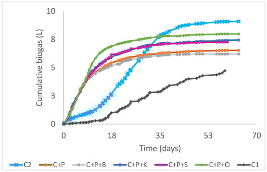 Evolution of the cumulative biogas production (L). Being C2: Cow manure 2; C+P: Cow manure+Pig slurry; C+P+B: Cow manure+Pig slurry+Bird manure; C+P+K: Cow manure +Pig slurry+Kitchen waste; C+P+S: Cow manure+Pig slurry+Sewage sludge; C+P+O: Cow manure+Pig slurry+Oily lacteous waste; C1: Cow manure 1.