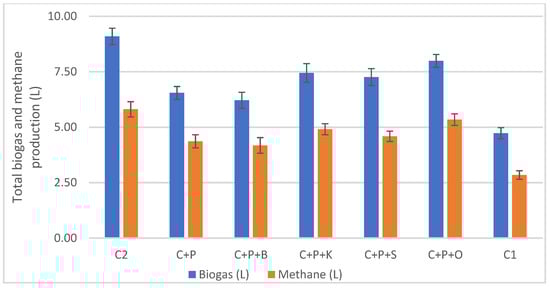 Biogas and methane volumes (in L) from the co-digestion tests. Being C2: Cow manure 2; C+P: Cow manure+Pig slurry; C+P+B: Cow manure+Pig slurry+Bird manure; C+P+K: Cow manure+Pig slurry+Kitchen waste; C+P+S: Cow manure+Pig slurry+Sewage sludge; C+P+O: Cow manure+Pig slurry+Oily lacteous waste; C1: Cow manure 1.