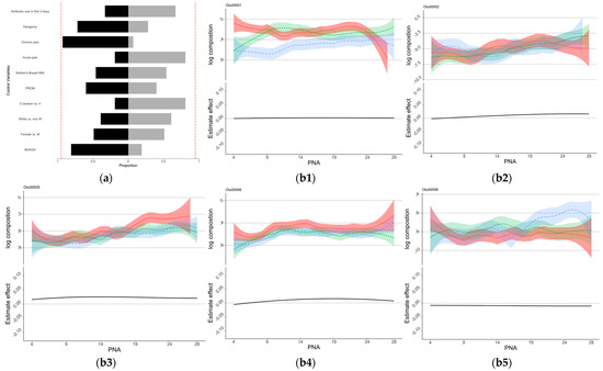 Control sign and OTUs for NSTRESS. (a) Control sign and NSTRESS. (b) OTUs associated with NSTRESS scores. (a) The proportions of the signs of the estimated coefficients of the control variables. Proportions of negative signs were shown as black blocks to the right, and those of positive signs were shown as light gray blocks to the left. Lower NSTRESS scores indicated better development, those variables in black indicated association with lower NSTRESS scores. The red dotted lines show the 90% of bootstrap. (b1–b6) The estimated time-varying effects of OTU on NSTRESS scores during the NICU stay. The x-axis represents the days after birth (PNA, postnatal age), the y-axis represents the log composition of the OTU abundance (top panel) and the estimated effect (bottom panel). The top panel “log composition” displays the trend of the log-transformed OTU compositions over the first 28 days of NICU stay for infants with different NSTRESS scores, with the infants being separated into three groups based on their NSTRESS score: high NSTRESS score (plotted in red), medium NSTRESS score (plotted in green), and low NSTRESS score (plotted in blue). The bottom panel “Estimate effect” is the estimated time-varying effects of OTUs on NSTRESS scores during the NICU stay.