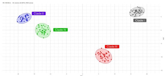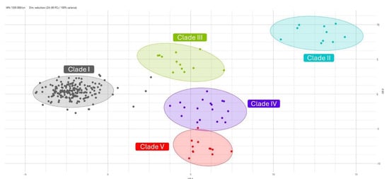 For the validation group, the model maintained a high level of performance, correctly classifying the majority of the isolates with high reliability. Clade I was well separated from the others, indicating the model’s high classification accuracy and the clade’s distinct spectral characteristics. With regard to the remaining clades, no overlaps were observed between clade III and clade IV and between clade II and clade IV, while only one average profile belonging to clade V showed overlap with clade IV, suggesting that there are areas for further model refinement once more isolates from this clade are available [].