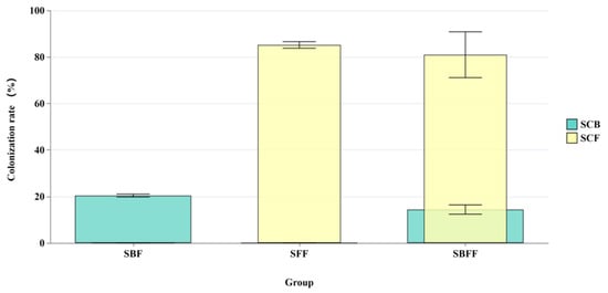 Source Tracker analysis could reflect the SynCom colonization state. SCBs colonized into the BOF (i.e., SBF, SBFF) at about 14.4–20.4% of the total bacteria count, while the value for SCFs was about 81–85.2% of the total fungi count (Figure 1), indicating that SCF strains colonized the BOF much easier and more extensively than the SCB strains. In addition, with the presence of both SCBs and SCFs (i.e., the SBFF samples), the colonization of the BOF by either fungi or bacteria was decreased compared to the case when either SCBs or SCFs were used alone.