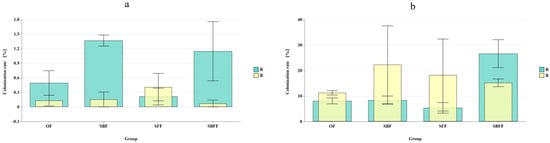 A different, yet intriguing scenario was observed with SCF-inoculated BOFs (i.e., SFFs and SBFFs). As shown in Figure 2b, fungi colonization from BOFs into bulk soil was increased by all BOFs. Intriguingly, the use of SCB-inoculated BOFs (SBFs) led to greater colonization of fungi (22.3%) than that of SCFs (18.22%)- and SCB + SCF (15.15%)-inoculated BOFs. Yet, the use of SCBs or SCFs alone did not change the colonization rate into rhizosphere soil (R), but the combined SCB + SCF-inoculated BOF (SBFF) increased the colonization of fungi into the rhizosphere soil significantly (8.05% to 26.62%). Overall, fungal colonization was significantly greater than bacterial colonization, indicating that soil fungi were easier to regulate than bacteria. However, the complex patterns observed for the fungal colonization with different BOFs suggested that the colonization of fungi into the rhizosphere and bulk soil was not a simple process, and more study was needed to understand it better.