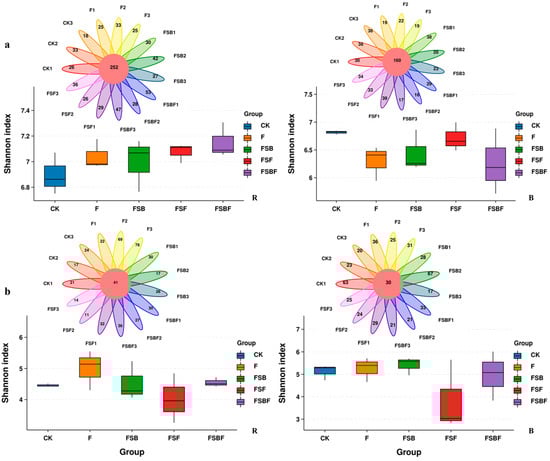 Effect of application of BOFs on soil microbial alpha diversity and species composition (B: bulk soil; R: rhizosphere soil: (a), bacteria, (b): fungi). CK: no organic fertilizers applied; F: organic fertilizer applied; FSB: SBF applied; FSF: SFF applied; FSBF: SBFF applied.