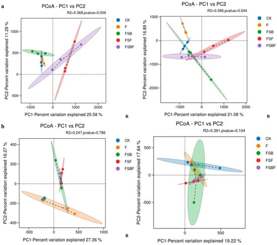 Notably, the application of BOFs significantly changed soil microbial beta diversity (Figure 4). PCoA analysis showed that BOFs significantly affected bacterial communities in both rhizosphere soil and bulk soil, while they did not significantly affect fungal communities. FSF and FSBF groups were clearly separated from the others; these observations confirmed the earlier observations made with the Source Tracker analysis.
