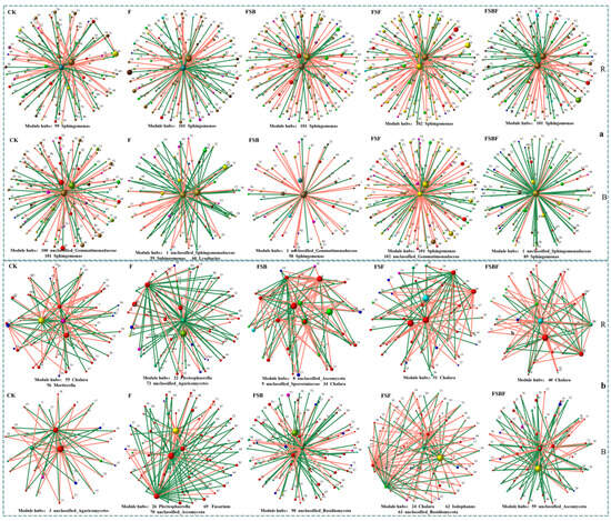 The correlation network diagram of each group (B: bulk soil; R: rhizosphere soil: (a), bacteria, (b): fungi). The correlation network was constructed as Spearman’s correlation, with a genera relative abundance of >0.1%, r > 0.8, and p < 0.05. Red lines represent significant positive relationships, and green lines denote negative relationships. The genera shown on these figures are the module hub (key species) in each network diagram (ZI (within-module connectivity), with >2.5 and PI (among-module connectivity) < 0.62. CK: no organic fertilizers applied; F: organic fertilizer applied; FSB: SBF applied; FSF: SFF applied; FSBF: SBFF applied.